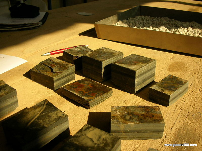 Probetas de pizarra, ensayos de laboratorio, estudios geotécnicos en Asturias         Ensayo de carga puntual, ensayos de laboratorio, estudios geotécnicos en Asturias